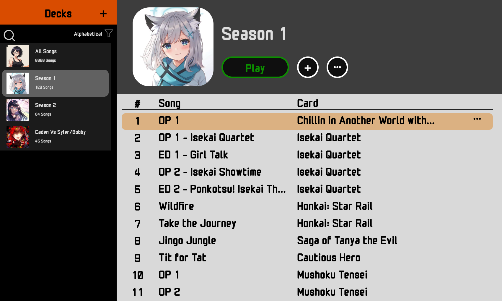 A card game based on the game karuta (かるた) played in Japan. In this game you have two players facing off against each-other with an arrangement of cards sitting in front of both players. When a song is played from the computer, players will have to touch the card that matches the song and the first player to hit the card gets to remove it from the board. If it was not on their side of the board they get to then give the other player a card from their board. The game ends when one of the players removes all cards from their side of the board.
